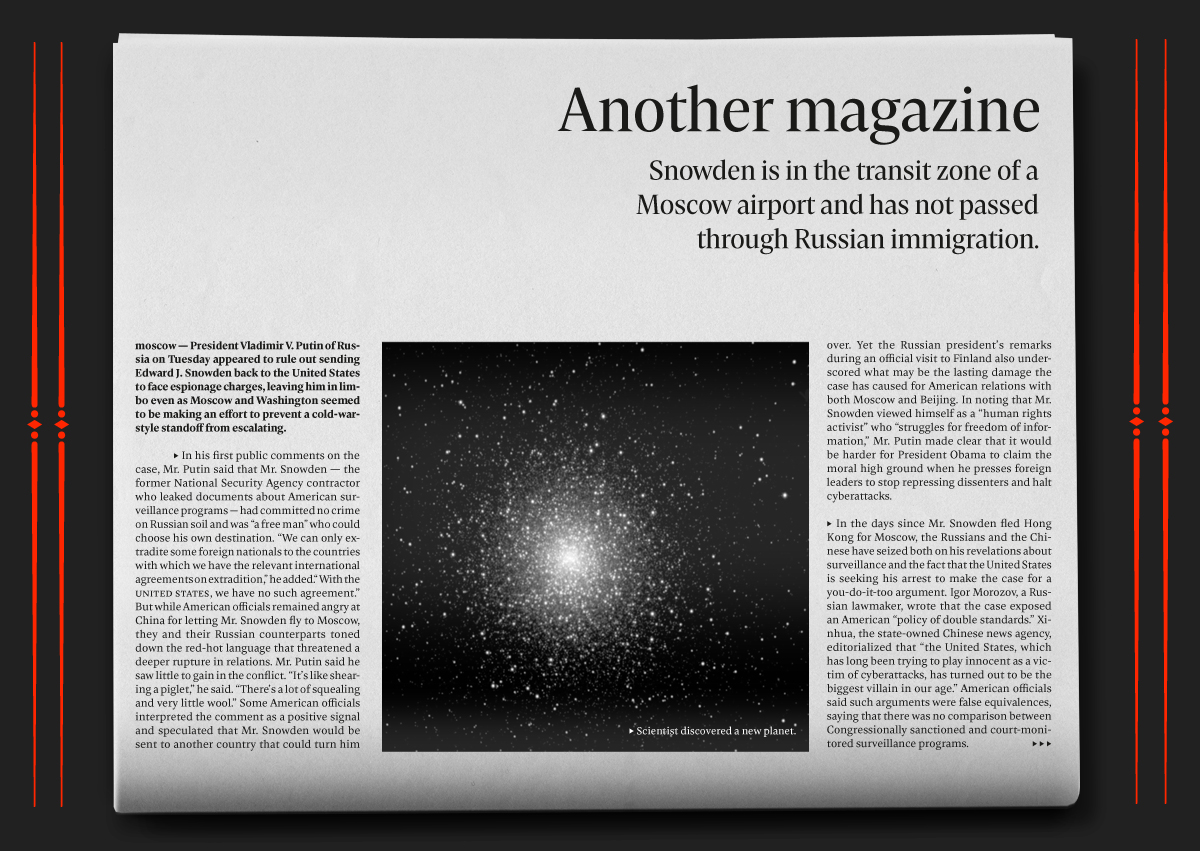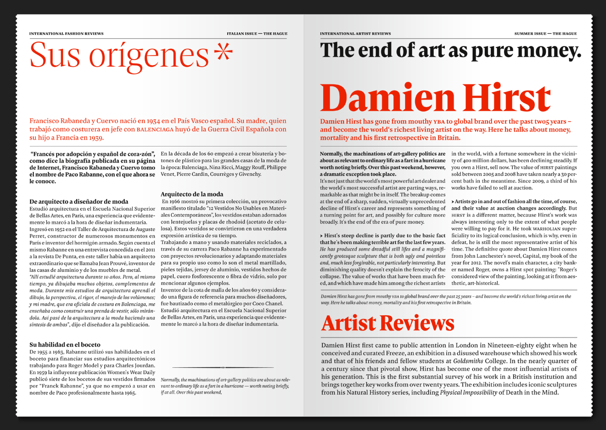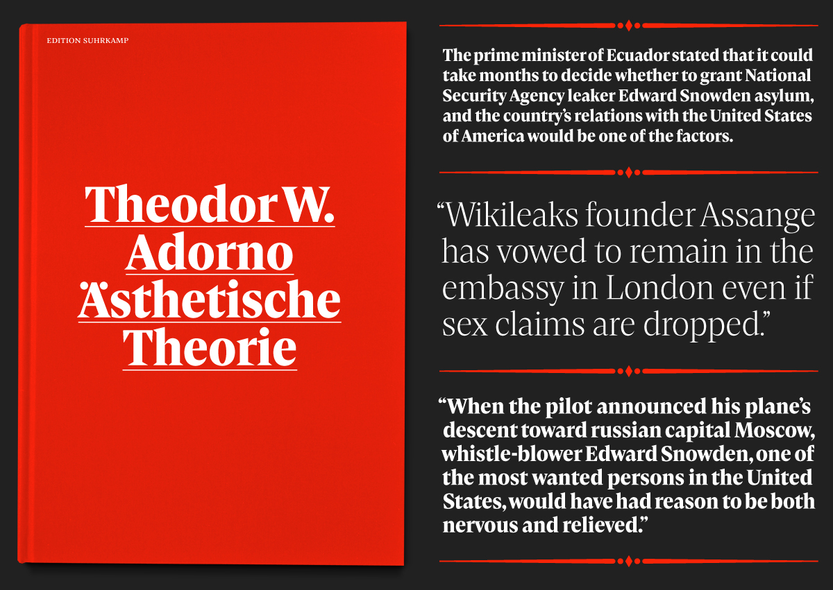 Thanks to its straightfoward forms with sharply cut details and pointy triangular serifs, it comes with great authority and vigor. This strictness is most evident in the Display styles, which are intended for headlines and other larger applications. They are characterized by a higher contrast, a tighter spacing and more compact shapes in comparison to the Text version. The five upright Display weights, ranging from Light to Bold, with stylistic alternates for diamond-shaped dots and punctuation, offer a variety of options for creating eye-catching typographic gestures.