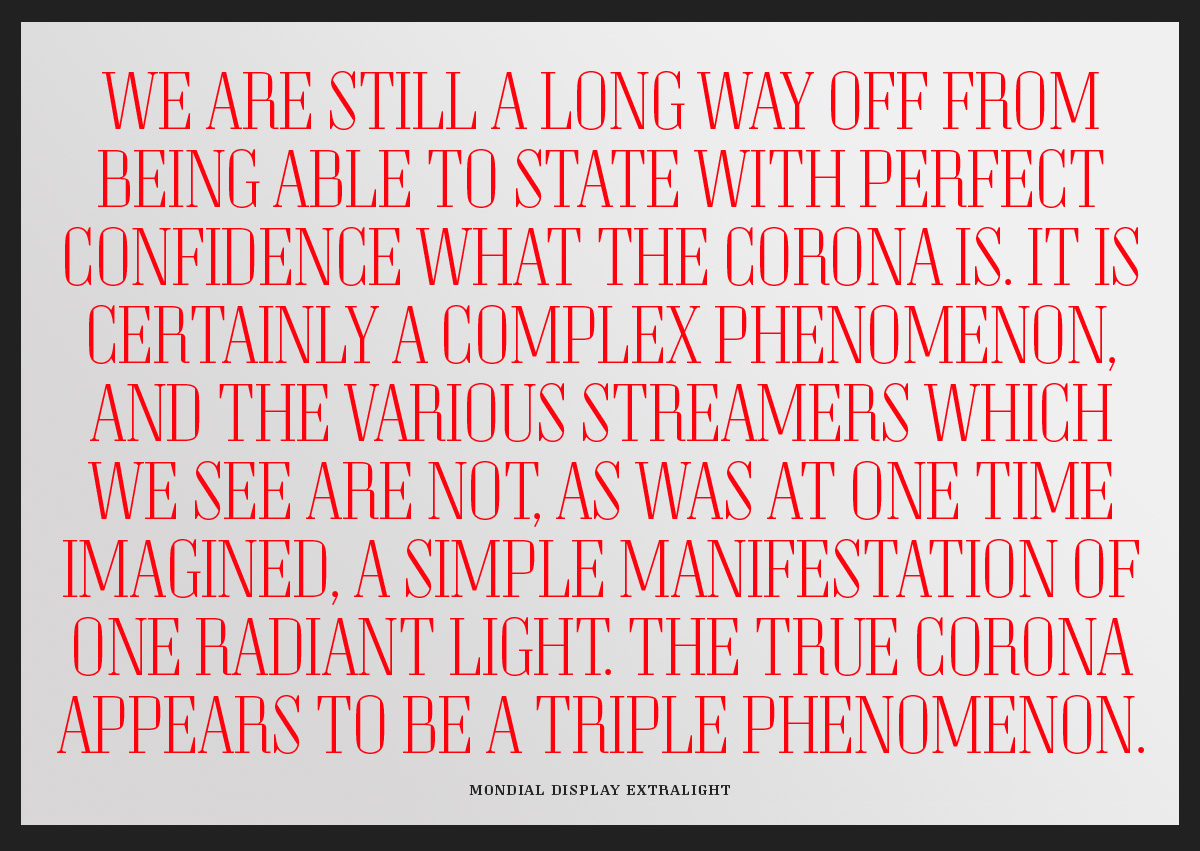 It is distinguished by abrupt transitions from thin to thick strokes, emphasizing its ultrarational character and adding a touch of art deco grandeur. Originally designed by Hans Bohn and issued in the 1930s by the Stempel type foundry in Frankfurt, this new digital interpretation by Lukas Schneider enhances the family with new weights, small caps, and many special characters. Mondial comes in two optical sizes, making it fit for a wide range of applications. The Display cuts work best in titles, headlines, magazine features, and other contexts that require cohesive word images with stylish details.